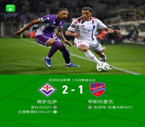 北京时间3月13日欧洲协会联赛 1/8决赛首回合,佛罗伦萨对阵琴斯托霍瓦。下半场布鲁内斯首开记录,两分钟后恩杜尔世界波扳平比分,补时阶段阿梅亚乌手球送点,古德蒙德松点射绝杀。最终比分佛罗伦萨 2-1 琴斯托霍瓦。